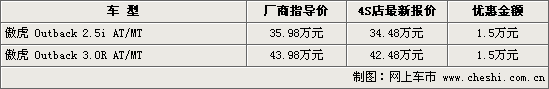 據(jù)網(wǎng)上車市價格監(jiān)測數(shù)據(jù)顯示,斯巴魯在北京地區(qū)的各4S店,對于Outback傲虎全系車型給出了相同的優(yōu)惠金額——1.5萬元。以下是我們在北京4S店內(nèi)了解到的價格:
